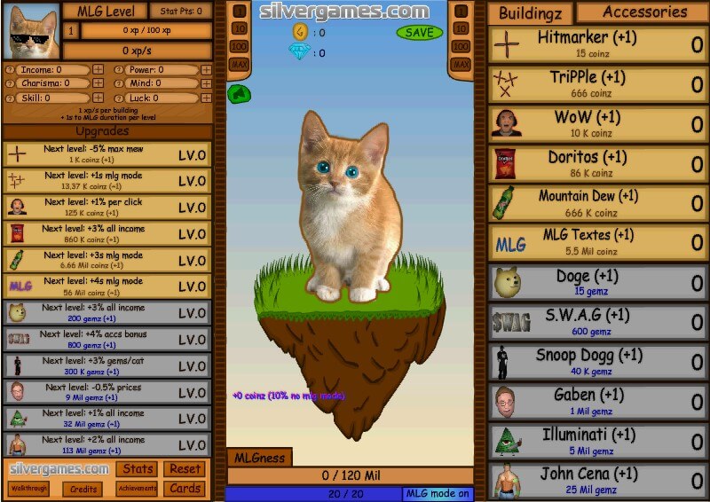 Kočičí obdoba slavného Cookie clickeru, zrzavé koťátko musíte vylepšovat, abyste za každé kliknutí získali co nejvíce peněz a aby vám peníze přibývaly i na pozadí, bez klikání. Z kotěte ale můžete těžit jen v MLG režimu, který si předem nabijete také klikáním.