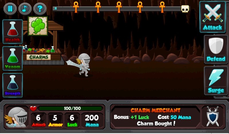 Bojová hra, která sice probíhá z velké části automaticky, ale přece jen nedostanete vítězství úplně zadarmo. Váš rytíř probíhá kolem stánků, ze kterých získá bonusové body, jenom, když na ně kliknete. Využití elixírů je také jen na vás.