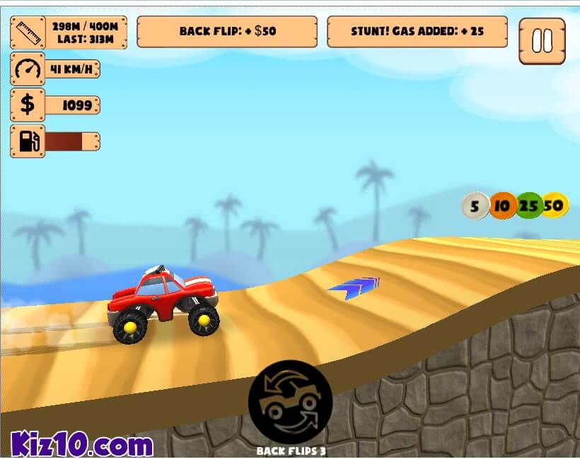 Zkuste se svými auty objet celý svět. Bohužel nemáte moc benzínu a tak bude potřeba průběžně nakupovat nové upgrady. Pokuste se dělat co nejvíce triků (backflip, frontflip) a doplnit si tak nádrž s turbem.