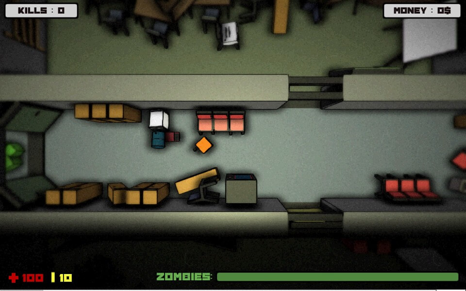 I když jsou postavy této hry jen kostičky, už podle nezdravě zelené barvy poznáte, kdo jsou zombíci. Snažte se jim co nejdéle odolávat a strategicky ustupujte, abyste získali čas na nabití zbraně.